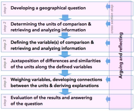 Based on the distinction in scientific discussions between comparisons as an everyday thinking process and as a scientific mode, we argue for defining comparison as a systematized method of school teaching. Contrary to the rare current contributions to the subject in geography education a method of comparison needs a clear and systematic guidance [,,]. It needs to be clear for both teachers and students how such a comparison is actually carried out and to what extent it goes beyond the juxtaposition of similarities and differences. Such a well-defined method with clear steps would provide a tool for the classroom, which may improve learners’ skills for multi-perspective discussion and problem solving. A specific model with clear steps for undertaking a comparison is very present in scientific discussion and will be discussed in the following paragraph.