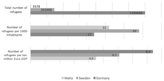 Recording figures for refugees living in Germany, Sweden, and Malta in 2017 (Source: [], own calculations).