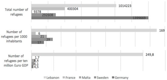 Recording figures for refugees living in Germany, Sweden, Malta, France, and Lebanon in 2017 (Source: [], own calculations).