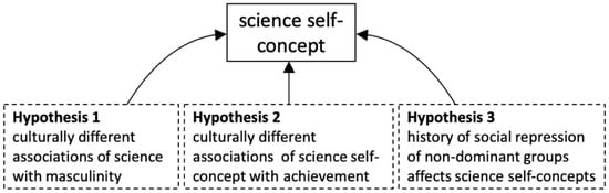 Despite the prevailing methodological difficulties, cultural differences in science self-concept have received considerable attention in science education research. The gender relations in science self-concept are a well-researched area. Since gender is a cultural construct [13], the gender relations touch differences in science self-concept that are associated with cultural categories. In numerous studies, it has been shown that boys tend to have stronger science self-concepts in Western societies than girls. This has, for instance, been shown for the U.S. [14], Germany [15], and the U.K. [16]. However, this gender gap might depend on the cultural context since it was not found in a study conducted in Malaysia and Singapore [17] and in some other cases. One hypothesis could explain these findings: in some countries, science might not be associated as strongly with masculinity as it tends to be in Western countries (Figure 1, left). However, the present literature does not yet allow for a definite answer.