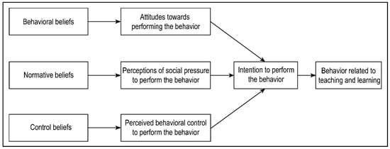 In general, the theory of planned behavior provides a model illustrating how teachers’ beliefs are causally linked to teachers’ behavior [38] (see Figure 1). Teachers’ beliefs determine their attitudes, perceptions of social pressure, and perceived behavioral control. These constructs influence teachers’ intentions to perform a behavior related to their professional practice. In turn, teacher intention is the only predictor of the teachers’ behavior in the classroom, i.e., whether teachers actually perform a behavior [15].