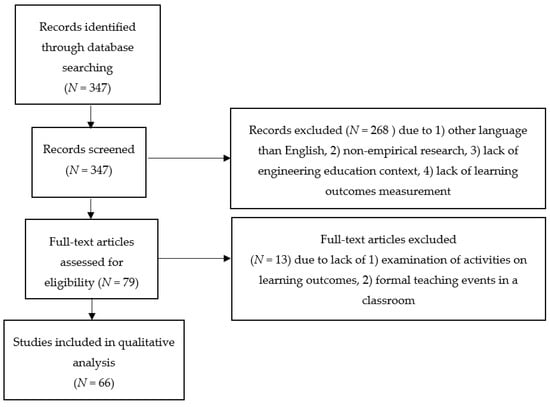 The search produced a total number of 347 articles. The abstracts of these articles were judged against the following inclusion criteria: (1) Written in English; (2) based on empirical research; (3) implemented in the context of engineering higher education; and (4) reported research on the effects of an active learning activity on student learning outcomes. With these criteria, we wanted to address only those journal articles that studied empirically the learning outcomes of instructional strategies. In this process, 268 articles were excluded, mostly because they did not examine the activities’ effects on student learning outcomes (n = 113). Other main exclusion criteria included a lack of active learning activities based on instructor-chosen activities (n = 48) and a lack of an engineering higher education context (n = 39).