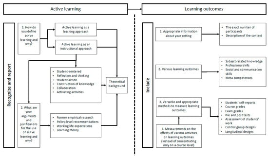 The methodological consideration of active learning intervention studies proposes that in the future, researchers should pay attention to the descriptions of study settings (e.g., the number of participants) as well as to how they approach learning outcomes. Quite many of the studies reviewed here focused on a single active learning activity and only one aspect of student learning (e.g., increase in subject-related knowledge). Further, studies preferred to use cross-sectional correlational designs and self-report measurements. The research perspective on active learning could be deepened by focusing on (1) various active learning activities, (2) content-related and affective learning outcomes, (3) objective and self-reported measurements, and (4) longitudinal designs with pre-post tests and a control group. This would also help instructors to better consider various aspects of learning activities from the viewpoint of the learning goals of their courses. After all, the development of higher education requires a systematic approach, that is research: In addition to the fact that evidence-based development offers a critical and analytical approach to explore and enhance quality in higher education, it often reveals complicated relationships or even counter-intuitive aspects that are important to take into account when enhancing instruction and learning [106].