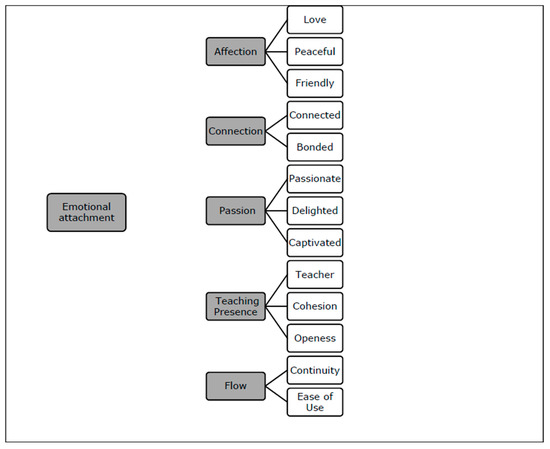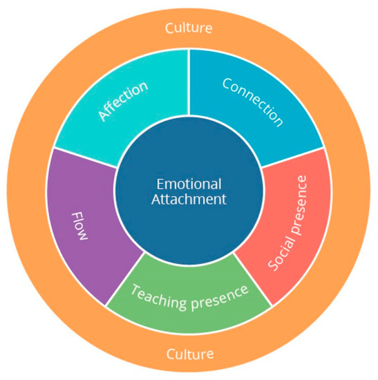 For Oxford [55], emotions amplify other learning motives. Emotions feature prominently in child development psychology [38,56], marketing [57] and organisational literatures [58,59]. For Oatley and Jenkins [60], emotions condition goals and moderate communications. Some distinguish fleeting, intensive and episodic emotions from more enduring but low-intensity moods [61]. Bechara and the Damasio [62] showed that emotions alter brain physiology and high-level cognitive functions (reasoning, decision-making, language, reading, and mathematics). Emotional considerations thus are primordial. As opposed to emotions, emotional attachment (EA) involves an intense bond of affection with evolutionary advantages, undermined by separation. Without parental attachment, children experience anxiety, insecurity, despair and depression [56]. Aside from parents, people attach themselves emotionally to sexual partners, places, brands, dogs, institutions, courses or teachers [57,63,64,65].