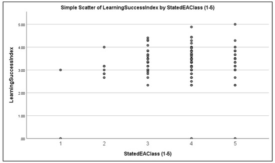 Eta (ϵ) also indicates the IV (EA) affects the DV (LS). Eta (ϵ) of 32 suggests a moderate positive association. Eta squared (ϵ2) has same interpretation as R2 and indicates that EA accounts for around 10% of learning success. The positive CV and ϵ support the rejection of the null hypothesis (H-EA0) and support its alternative that EA significantly influences LS. However, to confirm the impact of EA on LS, we also computed the Spearman’s rho (p). The statistic is a nonparametric alternative to the Pearson correlation coefficient but was insignificant (p of 0.114) with p = 0.131 and somewhat undermined confidence in the strength of association between Learning Success and Stated EA Class.