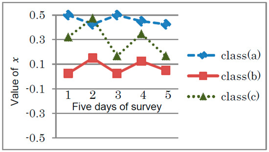 Each category—the desk arrangements and the questionnaires—was divided into two parts which relate to two states of spin variable ↑ and ↓, described in Section 2.2. For instance, in the photographic investigation, the state of desks where the angle deviates more than 20 degrees from the right angle were assigned to ↓, and the other states to ↑. In the questionnaires, positive answers and others were assigned to ↑ and ↓, respectively. Setting the two states, the value of x is obtained as described in Section 2.2. Figure 6 shows the change in the value of x on the desk arrangements over five days in September for the classes (a), (b) and (c).