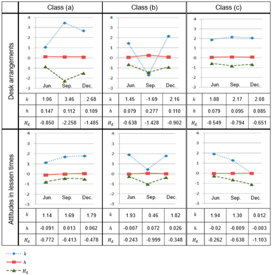 In Figure 7, we can find some differences in the changes in the parameters (k, h) and differential entropy Hd (k, h), which are numerically calculated by using the data of the desk arrangements and the questionnaire on attitudes in lessons. A remarkable change can be found in the parameters (k, h) and Hd of Class (b) during September to December. It shows that k (a measure of the strength of adaptation to neighbors) increases but h (a moral parameter) slightly decreases, and differential entropy Hd (mental disorder of the group) increases, in both investigations. This means that the interactions of each member were strong, but their morals were slightly weak, and the mental stability of the group was disturbed.