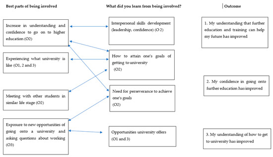Participants were asked to complete a paper (for students) and online (for all other groups) survey that asked questions around their personal background (year group, gender, school attended/length of time in currently employed position, relationship to university (did you/your parents attend university, do you/your parents encourage you to go to university), as well as their perceptions of the best parts of the program (qualitative: what are the best parts of the program, what have you learned from being involved?). The remaining three questions asked about the value of completing school and balancing time, alongside responses to the changes and improvements that occurred as a result of the program, to be discussed below (see value the things that matter, pp. 14–24 below).