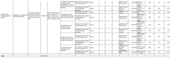Bias was prevented across all research questions and measures by the research team checking the research questions with widening participation staff at Western Sydney University who were not involved in the evaluation of the programs, but were regularly engaged with the schools, teachers, parents, and students, and were therefore able to offer insight into our questions and their relevance. The figures used for the excel spreadsheet, including the proxies, were also shared with members of the widening participation team to verify that the cost-to-benefit ratio was reasonable and in fact conservative when monetizing the immaterial benefits of the program.