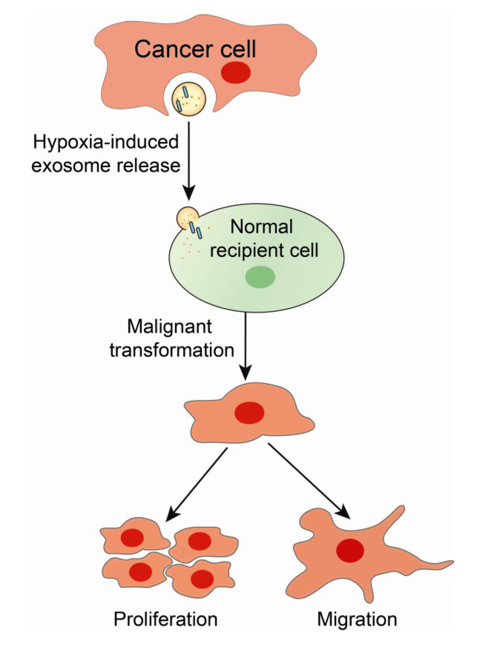 The hypoxia-induced release of exosomes from cancer cells is hypothesized to result in the malignant transformation and subsequent proliferation and migration of normal recipient cells.