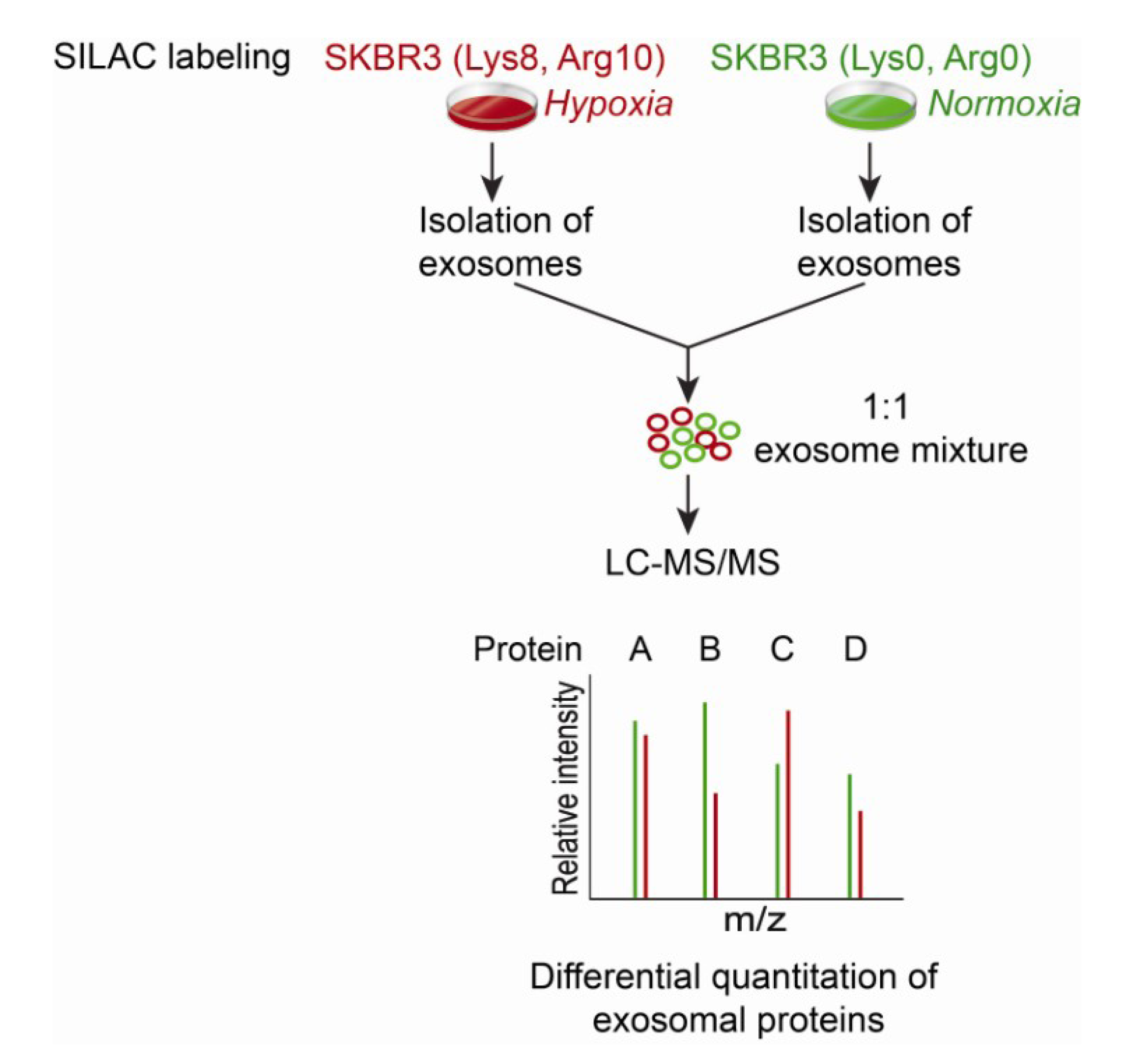 Workflow for stable isotope labeling with amino acids in cell culture (SILAC)-based quantitative proteomic profiling of exosomal proteins. Cell lines are cultured in SILAC media that has been supplemented with arginine and lysine containing 13C and 15N (Lys8, Arg10; “heavy”) or the naturally occurring 12C and 14N isotopes (Lys0, Arg0; “light”). After exposure to hypoxic or normoxic conditions, the exosomes are isolated from each cell line and are mixed at a 1:1 ratio followed by enzymatic protein digestion and liquid chromatography-tandem mass spectrometry (LC-MS/MS) analysis.