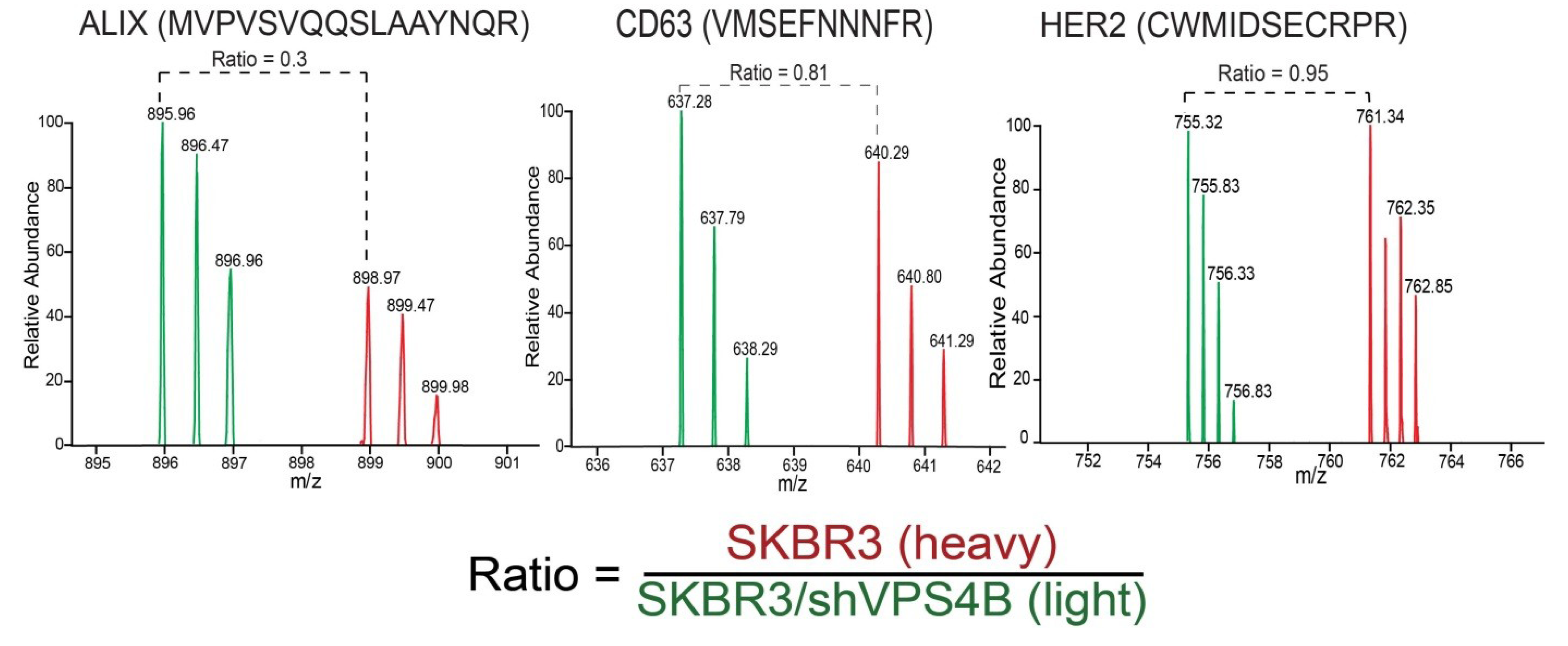 Representative SILAC MS1 spectra of Alix, CD63 and HER2 peptides with decreased relative abundance in exosomes that are derived from SKBR3 cells with ablated VPS4B expression. The relative abundance ratios were determined by IsoQuant.