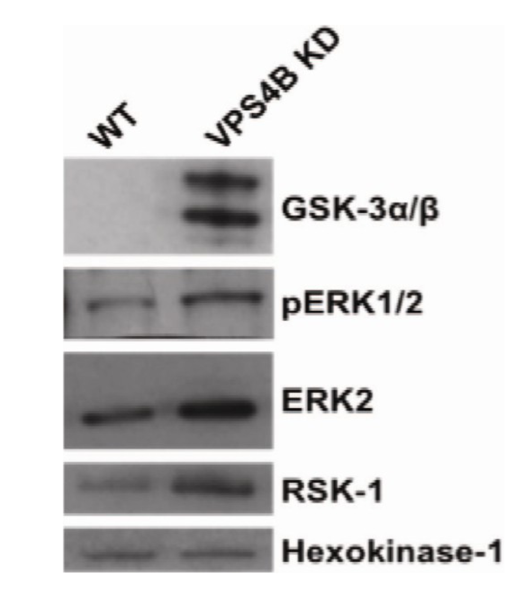 Immunoblot analysis shows accumulation of GSK3α/β and phosphorylated ERK2 signaling pathway proteins such as RSK1 in exosomes derived from SKBR3 cells with decreased VPS4B expression. Hexokinase-1 was included as an immunoblotting control for the specificity of the effect of decreased VPS4B expression. The level of hexokinase-1 expression was unchanged between exosomes from SKBR3 cells expressing WT VPS4B and cells with shRNA-mediated knockdown of VPS4B expression (VPS4B KD).