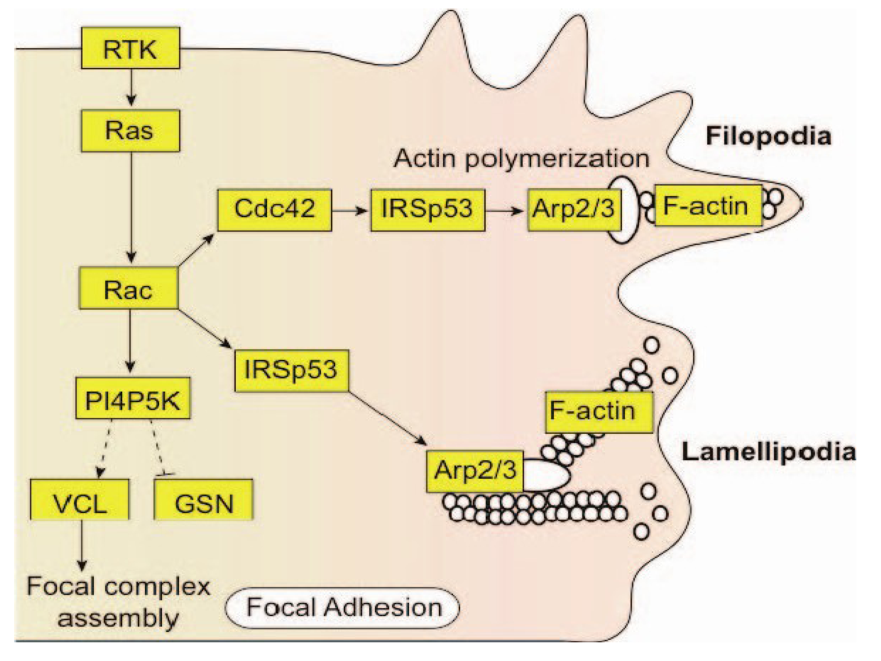 Proposed breast cancer signaling pathway based on the KEGG network pathway analysis of hypoxia-activated tumor cell migration. In EGF-stimulated SKBR3 cells with decreased VPS4B expression, the assembly of F-actin and the formation of filopodia were promoted, suggesting that the dysfunction of the MVB pathway stimulates the migration of tumor cells under hypoxic conditions.