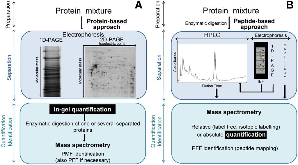 Flowchart of the most currently used techniques in view of a comparative and quantitative proteomics approach using a protein-based approach (panel A) or a peptide-based approach (panel B). The proteomic analysis is made up of four steps: (i) sample conditioning (not illustrated); (ii) sample preparation; (iii) separation; and (iv) quantification and identification of the proteins. The separation can be performed on proteins or peptides, by electrophoresis or chromatography. The quantification is possible either in-gel or off-gel, whereas the identification is always performed by MS. MS, mass spectrometry; HPLC: high performance liquid chromatography; IEF: isoelectric focusing; PAGE: polyacrylamide gel electrophoresis; PMF: peptide mass fingerprint; PFF: peptide fragmentation fingerprint.