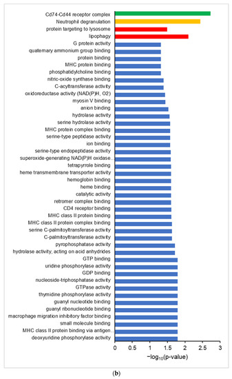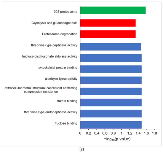 Quantitative proteogenomics analysis utilizing isobaric peptide labeling with the TMT reagent detected several proteins showing increased abundance in the inflamed proximal colon samples. Three of these proteins, haptoglobin, hemopexin, and alpha-1-acid glycoprotein 2, were found to have increased abundance in the serum of Rag2−/−Il10−/− mice with chronic inflammation, being identified in an earlier proteomics study of this model by Knutson et al. [50], indicating their utility as biomarkers for global inflammation; these proteins have also been seen to be increased in abundance in response to sepsis [51], chronic obstructive pulmonary disorder [52], and colorectal cancer [53]. The increased abundance in Prss2, a serine protease involved in the remodeling of the extracellular matrix [54], suggests that the inflamed proximal colon tissue can be considered to be in a chronically inflamed state [55] as increased abundance in Prss2 differentiates IBD patients from healthy patients [56], making the five-month exposure of these mice a suitable model for chronic inflammatory bowel disease. Other indications of chronic inflammation are the increased abundance in the H-2 class II histocompatibility antigen gamma chain Cd74 and the lysosome membrane protein 2 Scarb2, which are indicative of neoantigen generation and presentation to T cells [57]. Other increased proteins consistent with an inflammatory phenotype include heavy-chain Cytochrome b-245 (Cybb), a key component of NADH oxidase in phagocytes needed to create superoxides as a part of the inflammatory response [58], serine palmitoyltransferase 1 (Sptlc1), the initial enzyme involved in sphingolipid synthesis [59] and GTP-binding protein Rheb (Rheb) which serves to activate mTOR1 and promote signal transduction [60]. Interestingly, the increase in abundance of Upp1 seen in the inflamed samples is consistent with the development of many cancers [61,62], indicating a degree of oncogenesis may have begun. These abundance changes to known factors of inflammation demonstrate the accuracy of the TMT-based quantitative proteomics strategy. The loss in abundance of muscle-specific proteins such as Aldoa (fructose-bisphosphate aldolase) and Mustn1 (musculoskeletal embryonic nuclear protein 1) may be due to alteration of the muscularis propria in the proximal colon in response to prolonged inflammation [63].