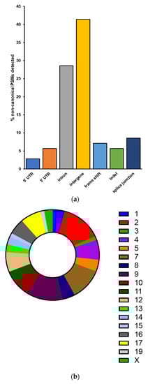 For the verified non-canonical peptides, the majority were found to be associated with intergenic regions not normally transcribed and translated into proteins (40.85%) as well as introns retained in the translated proteins (28.17%) (Figure 4a). The remaining variant peptides comprise indels, frameshifts, splice junctions, and sequences containing 5′ and 3′ untranslated regions. These peptides are derived from genes and intergenic regions found throughout the genome, excluding chromosomes 6, 18, and 20 (Figure 4b). Gene Ontology analysis of proteins corresponding to those non-canonical sequence peptides found within annotated genes showed no significantly enriched biological pathways common to this set of gene products.