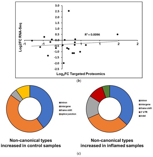Differential abundance analysis of non-canonical peptides detected in inflamed proximal colon samples. (a) Fold-changes of variant peptides in the inflamed and control proximal colon samples, as measured via targeted mass spectrometry. Asterisks indicate a p-value < 0.05. (b) Comparison of RNA-Seq, proteomics-derived change in peptide abundances. (c) Categories of non-canonical peptides in peptides that show increased and decreased abundance in the inflamed proximal colon samples.