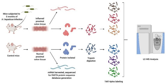 Outline of the experimental procedure. Rag2−/−Il10−/− mice were infected with Helicobacter hepaticus to induce inflammation, and proximal colon proteins and mRNA were collected for proteogenomic analysis. Peptides were digested and labeled for differential proteomic analysis and variant discovery, with some unlabeled peptides reserved for quantitation of variants. Created with BioRender.com (accessed on 10 August 2021).