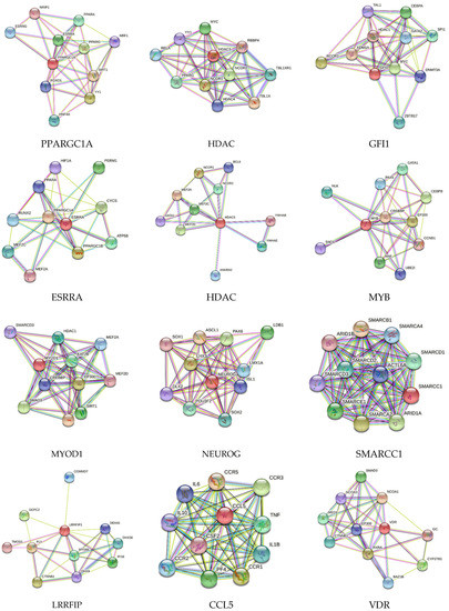 STRING network analysis of protein–protein interaction for peroxisome proliferator-activated receptor gamma coactivator 1-alpha (PPARGC1A); histone deacetylase 3 (HDAC3); zinc finger protein Gfi-1 (GFI1); steroid hormone receptor ERR1 (ESRRA); histone deacetylase 5 (HDAC5); transcriptional activator Myb (MYB); myoblast determination protein 1 (MYOD1); neurogenin-2 (NEUROG2); Swi/snf-related, matrix-associated, actin-dependent regulator of chromatin subfamily c member 1 (SMARCC1); leucine-rich repeat flightless-interacting protein 1 (LRRFIP1); C-C motif chemokine ligand 5 (CCL5); and vitamin D receptor (VDR).