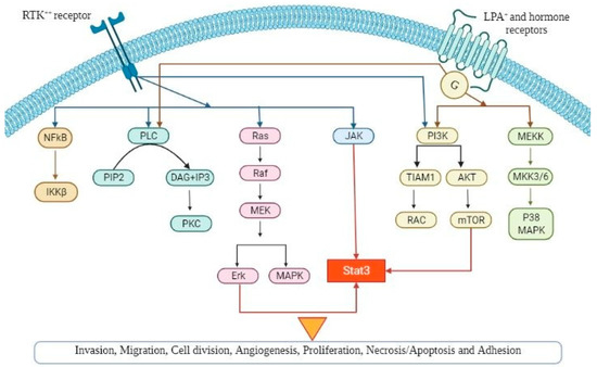 - Liang, R.; Chen, X.; Chen, L.; Wan, F.; Chen, K.; Sun, Y.; Zhu, X. STAT3 signaling in ovarian cancer: A potential therapeutic target. J. Cancer 2020, 11, 837–848. [Google Scholar] [CrossRef] [PubMed] [Green Version]