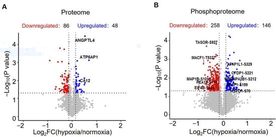 In the proteome study, a total of 3694 proteins were identified, of which 3526 proteins were quantified (Supplementary Figure S1 and Table S1). Statistical analysis revealed 134 significantly changed proteins (p < 0.05, |log2 (fold change)| > log2 (1.1)), 86 downregulated proteins and 48 upregulated proteins (Supplementary Table S2, Figure 2A and Figure 3A). In phosphoproteome analysis, we identified a total of 9642 peptides, of which 6102 peptides were phosphorylated and quantified, which corresponded to 2347 phosphoproteins (Supplementary Table S3). Statistical analysis revealed 258 downregulated phosphopeptides and 146 upregulated phosphopeptides, respectively, corresponding to 219 and 142 phosphoproteins (Supplementary Table S4, Figure 2B and Figure 3C). To check the overlap between proteome analysis and phosphoproteome analysis, Venn diagrams were drawn. It showed that 1116 proteins were quantified in both proteome analysis and phosphoproteome analysis. In total, two proteins were upregulated and seven proteins were downregulated in both proteome analysis and phosphoproteome analysis (Supplementary Figure S2).