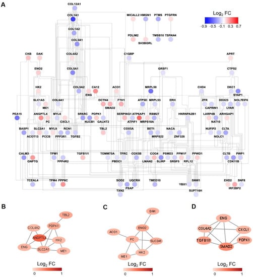 Protein-protein interaction (PPI) network analysis. (A) PPI network for all the significantly changed proteins in proteome analysis. The color of each node is assigned according to the log2 transformed fold change of the protein abundances of hypoxia to normoxia-treated samples. (B–D) PPI network for upregulated proteins enriched in carbon metabolism (B), response to oxygen levels (C), regulation of TGF-β receptor signaling pathway (D).
