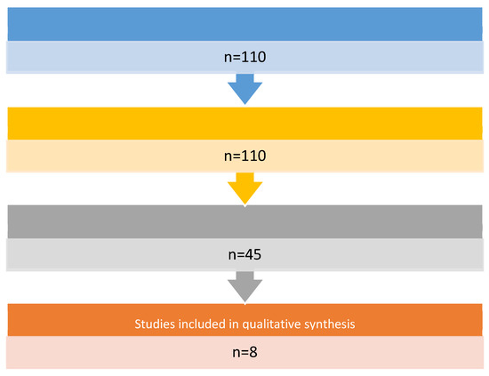 The literature was analyzed through a search in the “PubMed” database using the search terms Proteome * OR Proteomics AND Head and Neck cancer. Limitations on publication date, study design, and language were applied in the search strategy. We have limited the search to reviews, systematic reviews, and meta-analyses, published in the English language over the past decade. The titles and abstracts of the identified records were initially screened and selected by five independent reviewers (G.R., M.G.B., I.F., F.Z., and L.C.) based on their relevance to the review topic. The following set of inclusion criteria, chosen in a shared way, was applied individually to the selected articles in their full-text version: use and study of salivary biomarkers in oncology diagnostics of the head and neck. The literature search produced 110 records (Figure 1). Subsequently, 102 studies were excluded because they did not meet the objective of our review. At least eight studies were included and discussed (Table 1)