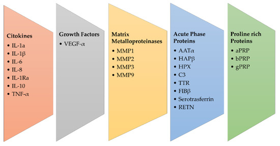 Starting from the observation that chronic inflammation and oral cancer are connected, acute phase response proteins (APPs) have been detected in the saliva of patients with OSCC, and in particular the APP Haptoglobinβ (HAPβ), α-antitrypsin (AATα), complement-C3 (C3), hemopexin (HPX), serotransferrin, transthyretin (TTR) and fibrinogen β (FIBβ) [31]. In addition, it was suggested that increased levels of HAPβ, AATα, C3, HPX, TF, TTR, FIBβ, and ABG were suitable biomarkers for the early diagnosis of OSCC [31,32]. Yu et al. supported this hypothesis by assembling an inflammatory protein panel for the initial screening of OSCC [33].
