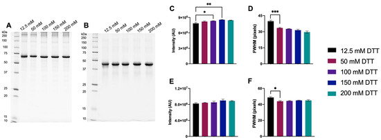 A broad range of DTT concentrations, 12.5–200 mM, was initially tested to identify an effective concentration. An effective concentration is defined as the minimum concentration required for DTT to be in assumed excess, driving the equilibrium of the proteome to the fully reduced state and above which no further significant improvements in resolution are detected. As 12.5 mM DTT was previously used routinely [16,19,20], this was selected as the baseline for comparison. To assess the relationship between disulfide bond content and DTT, protein standards with known disulfide bond content were used: BSA (17 disulfide bonds) and CEA (1 disulfide bond) (Figure 1; see also Supplementary Figure S4 for CEL, having 4 disulfide bonds). For BSA, there was a significant increase in monomer band intensity as DTT concentration was increased up to 150 mM, and FWHM was significantly lower with ≥50 mM DTT compared to 12.5 mM DTT. For CEA, no significant differences in monomer band intensity were measured, but FWHM significantly decreased with ≥50 mM compared to 12.5 mM DTT.