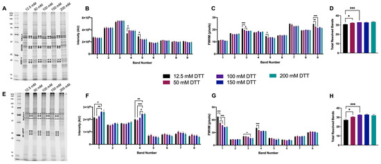Proteome extracts reduced with 12.5–200 mM DTT. Representative 1DE gel lanes of total green lentil proteome extracts (A) and total mouse brain proteome extracts (E). Bar graphs showing band intensity (B (lentil) and F (brain)); FWHM (C (lentil) and G (brain)); total number of resolved bands (D (lentil) and H (brain)). Bands are as indicated on gel image. Statistically significant differences are indicated by ‘*’ where one symbol indicates p < 0.05, two indicate p < 0.005, and three indicate p < 0.001 (One-way ANOVA, n = 4).