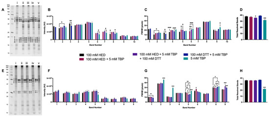 Proteome extracts reduced with DTT, TBP, and/or HED. Representative 1DE gel lanes of total extracted green lentil proteome (A) and total extracted mouse brain proteome (E) with treatments of 100 mM HED (i), 100 mM HED + 5 mM TBP (ii), 100 mM HED + 5 mM TBP + 100 mM HED (iii), 100 mM DTT + 5 mM TBP (iv), 5 mM TBP (v). Bar graphs showing band intensity (B (lentil) and F (brain)), FWHM (C (lentil) and G (brain)), and total number of resolved bands (D (lentil) and H (brain)). Bands are as indicated on gel image. Statistically significant differences are indicated by ‘*’ where one symbol indicates p < 0.05, two indicate p < 0.005, and three indicate p < 0.001 (One-way ANOVA, n = 6).