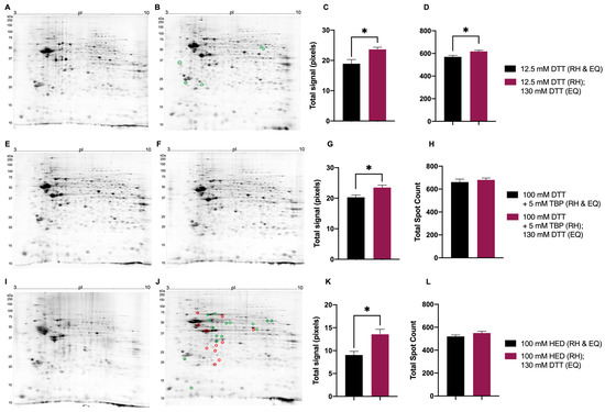 Representative 2DE gel images of resolved total mouse brain proteome comparing treatments prior to rehydration (RH) and during equilibration (EQ). Extracted mouse brain proteome treated with 12.5 mM DTT (RH and EQ) (A), 12.5 mM DTT (RH) + 130 mM DTT (EQ) (B), 100 mM DTT + 5 mM TBP (RH and EQ) (E), 100 mM DTT + 5 mM TBP (RH) + 130 mM DTT (EQ) (F), 100 mM HED (RH and EQ) (I), 100 mM HED (RH) + 130 mM DTT (EQ) (J). Bar graphs showing total signal (C corresponding to images A and B, G corresponding to images E and F, K corresponding to images I and J) and total spot count (D corresponding to images A and B, H corresponding to images E and F, L corresponding to images I and J). Green and red circles identify significant differences in average normalized spot volumes when fold change was ≥2 (green = increased; red = decreased) Statistically significant differences are indicated by ‘*’ where p < 0.05 (t-test, n = 6).