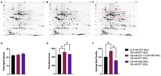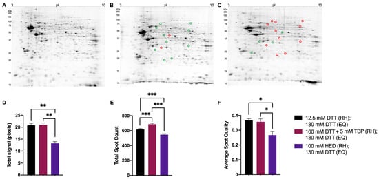 Representative 2DE gel images of total green lentil proteome. Extracted green lentil proteome with treatments of 12.5 mM DTT (A), 100 mM DTT + 5 mM TBP (B), 100 mM HED (C) prior to rehydration and each treated with 130 mM DTT during equilibration. Bar graphs showing total signal (D), total spot count (E), and average spot circularity (F). Green and red circles identify significant differences in average normalized spot volumes relative to reduction with 12.5 mM DTT when fold change was ≥2 (green = increased; red = decreased). Statistically significant differences are indicated by ‘*’ where p < 0.05 (One-way ANOVA, n = 2–3).