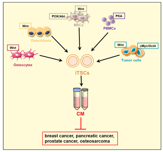 Generation of induced tumor-suppressing cells (iTSCs). iTSCs can be generated from osteocytes, osteoblasts, mesenchymal stem cells (MSCs), peripheral blood mononuclear cells (PBMCs), and varying types of tumor cells by the activation of Wnt, PI3K, and PKA signaling pathways, as well as the overexpression of cMyc and Oct4. The iTSC-derived conditioned medium (CM) has been shown to be effective in suppressing the progression of breast, pancreatic, and prostate cancer cells, as well as osteosarcoma cells.