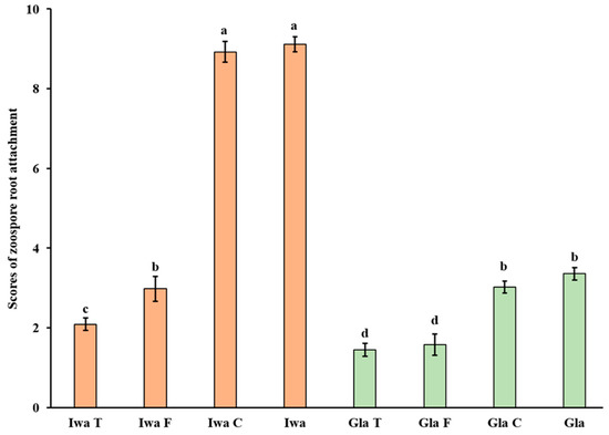 Effects of pre-enzyme treatment on zoospore root attachment for the ‘Gladiator’ (Gla, green bars) and ‘Iwa’ cultivars (orange bars). T: trypsin (20 µg/mL); F: PNGase F (50 units/mL); C: cellulase (1 mg/mL). Error bars represent standard deviations based on three biological replicates. Lower case letters denote values that are significantly different from each other. p (cultivars) < 0.001, p (treatment) < 0.001, p (cultivar × treatment) < 0.001. LSD (0.05) = 0.45.
