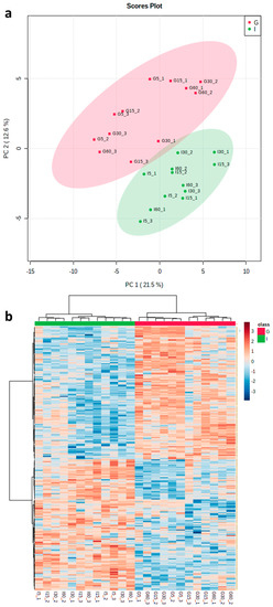(a) Principal component analysis (PCA) of all identified proteins from both resistant and susceptible cultivars (n = 3) at four incubation times (5, 15, 30 and 60 min). (b) Heatmap analysis of all significantly abundant proteins (‘Gladiator’ vs. ‘Iwa’) at four incubation times (5, 15, 30 and 60 min). G: ‘Gladiator’; I: ‘Iwa’.