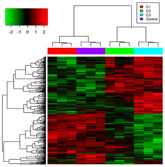 A total of 5920 proteins was identified from 661W photoreceptor cells in this study (Supplementary Table S1). These proteins were quantified with multiple peptides at an initial protein FDR less than 1%. There were 410 proteins identified as differentially abundant under different conditions based on the ANOVA analysis (which met the requirements of both p-value < 0.05 and the absolute value of fold change > 1.2). Hierarchical clustering analysis was applied to those differentially expressed proteins and showed similar expression patterns of proteins increased or decreased in abundance between 6 h and 12 h of 50 µM H2O2 treatments (C2 and C3, respectively) (Figure 1). However, fewer proteins were changed in abundance after 0.5 h of 10 µM H2O2 treatment (C1), indicating that the cellular response under this relatively mild condition was quite distinct to that observed for the other two H2O2 treatments.