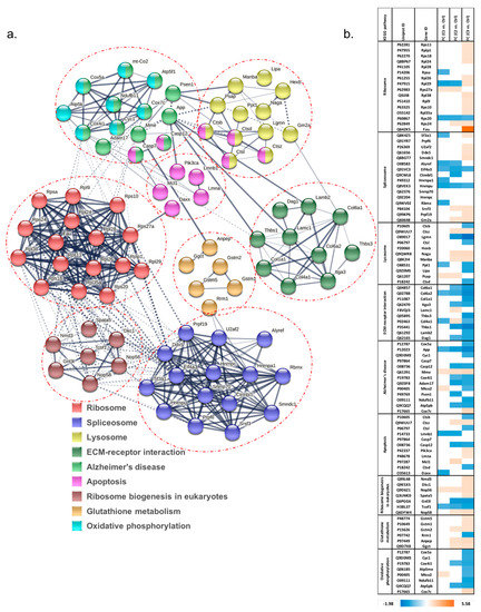 The network of interacting proteins that were differentially expressed among all groups based on ANOVA was generated using String. KEGG pathway analysis was used to display the altered pathways, including ribosome, spliceosome, lysosome, ECM-receptor interaction, Alzheimer’s disease, apoptosis, ribosome biogenesis in eukaryotes, glutathione metabolism, and oxidative phosphorylation (Figure 5a,b). As expected, C3 (50 µM, 12 h) treatment produced the maximum number of molecules regulated in these KEGG pathways. Most ribosome and spliceosome proteins were increased in abundance. In addition, three glutathione S-transferases—Gstm1, Gstm2 and Gstm5—were found with increased abundance under C3, indicating activated glutathione metabolism. In addition, proteins involved in extracellular matrix (ECM)-receptor interaction were decreased in abundance. Oxidative phosphorylation was disrupted, with seven out of eight proteins in this pathway decreased in abundance by longer and more concentrated H2O2 treatment. Amyloid precursor protein (APP), belonging to the Alzheimer’s pathway, was decreased in abundance in cells with increased H2O2 treatments, and had fold changes of −1.14, −1.35, and −1.63 in C1, C2, and C3, respectively (all p-value < 0.05). Another protein in this pathway, presenilin 1 (Psen1), was also decreased in abundance under C2. Intriguingly, membrane metallo-endopeptidase (MME), which is considered one of the important β-amyloid (Aβ)-degrading enzymes related to prevention of Alzheimer’s disease (AD) pathology [26], was identified with increased abundance in all H2O2 treatment groups. This may occur as part of an induced compensatory response against H2O2 toxicity, which in turn decreased levels of target proteins including β-amyloid [27]. Additionally, the increased abnormal regulation of proteins in KEGG pathways related to lysosomes, apoptosis, and ribosome biogenesis was identified with more severe H2O2 treatment as well.