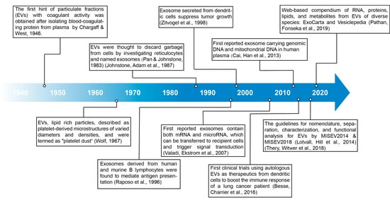 Cai et al. first reported exosomes carrying genomic DNA and mitochondrial DNA in human plasma []; in the same year, the Nobel Prize was awarded for the discovery of vesicle trafficking, then Besse et al. [] gave impetus to the first clinical trials and used autologous EVs as therapeutics from dendritic cells to boost the immune response of a lung cancer patient. Incited by the tremendous medical prospects, the scientific community has enthusiastically produced a wealth of studies and addressed the need for guidelines and standardization. Worth noting are the efforts by Lotvall and Thery et al. who updated guidelines of nomenclature, separation, characterization, and functional analysis for EVs with minimal information for studies of EVs, MISEV2014 and MISEV2018, to generate references to make data reliable and reproducible between labs [,] (Figure 1).