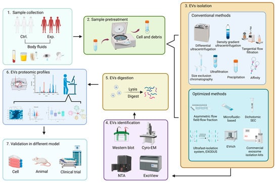 There are plenty of proteome studies on the essential components of EVs in biofluids, mostly blood and urine, to identify candidate biomarkers. Proteomics is a highly promising tool for EVs and is able to classify tumor types and establish signature proteins and robust biomarkers. Hoshino et al. [] conducted proteomic profiles of EVs from 426 human cancer samples to identify and classify uncertain primary tumor subtypes illustrating that EVs from body fluids possess a potential value to improve the remedial outcome of lethal cancer. In addition, EVs possess extraordinary features ideal for proteomics using mass spectrometry (MS) []: relatively low complexity, enrichment in low abundance molecules, a conserved set of common proteins that are vital for vesicle biogenesis, structure, trafficking, and the presence of specifical proteins from the (pathological) cell type they originated. Proteomics gives access to post-translationally modified (PTM) proteins that were altered in function, physicochemical properties, and cellular pathogenesis through chemical modification after translation, including cleavage of precursors, formation of disulfide bonds, covalent attachment or removal of low-molecular-weight groups, and so forth. Glycosylation, phosphorylation, ubiquitination, SUMOylation, acetylation, and S-nitrosylation have been identified and studied in EVs []. For example, immobilized metal affinity chromatography (IMAC) is a common method to enrich phosphopeptides with robust interaction between phosphate groups and metal ions, and hydrophilic interaction chromatography (HILIC) is a favorable method to concentrate glycopeptides due to excellent enrichment efficiency and unbiased binding; Zheng et al. [] fabricated the above and developed a core–shell carbonyl-functionalized magnetic zirconium–organic framework (CFMZOF) to identify phosphopeptides and glycopeptides simultaneously in a human urine sample with high selectivity and a low detection limit. Nunez et al. [] first defined the proteome landscape of diabetes patients’ serum-derived EVs and quantified the circulating global proteins and phosphoproteins simultaneously. More importantly, proteomics boosts the dissection of the protein signature, signaling pathways, and clinical pharmacokinetics of EVs by improving the proteome sequence coverage to better characterize their molecular cargo via identifying PTMs and proteoforms in particular pathological events with the ultimate aim of achieving clinical translation.