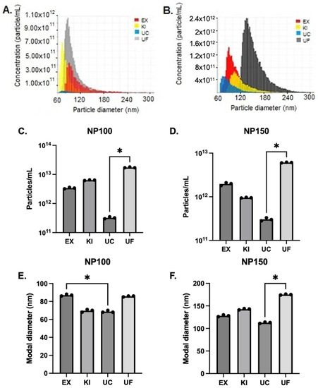 Comparison of size distribution and concentration of extracellular vesicles purified by four different techniques: (EX) ExoQuickTM, (KI) Total Isolation Kit, (UC) Ultracentrifugation, and (UF) Ultrafiltration. (A) Concentration and size distribution of extracellular vesicles measured by tunable resistive pulse sensing (qNano) using a Nanopore NP100, and (B) and Nanopore NP150. (C) Reproducibility of the four techniques according to the concentration of particles measured by tunable resistive pulse sensing (TRPS) using a Nanopore NP100, (D) and Nanopore NP150. (E) Modal particle diameter of extracellular vesicles measured by tunable resistive pulse sensing (qNano) using a Nanopore NP100, (F) and Nanopore NP150. The data in this graph are the values of each technical replicate. Asterisks represent p ≤ 0.05 using Dunn’s multiple comparison test.