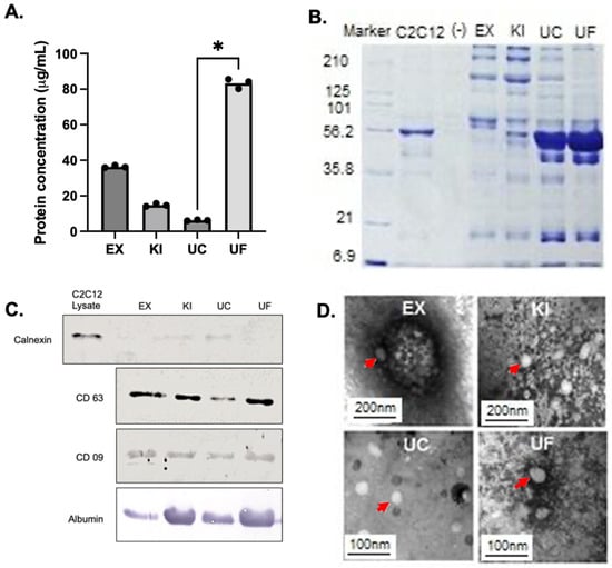 (A) Quantification of total exosomal proteins per mL of the purification techniques. The data in this graph are the values of each technical replicate. Asterisks represent p ≤ 0.05 using Dunn’s multiple comparison test. (B) Protein profile of the purification techniques analyzed by 12% SDS-PAGE: (Marker) Protein marker (Bio-Rad), (C2C12 EVs) positive control, (−) Negative control, (EX) ExoQuickTM, (KI) Total Isolation Kit, (UC) Ultracentrifugation, and (UF) Ultrafiltration. (C) Western blot analysis detected an antibody against the exosomal surface protein CD9 and an antibody against the exosomal surface protein CD63 and albumin. Calnexin was used to show the absence of endoplasmic reticulum proteins in purified EVs. (D) Negative staining of EVs by transmission electron microscopy (TEM). Red arrows indicate particles with the size and shape characteristics of EVs.