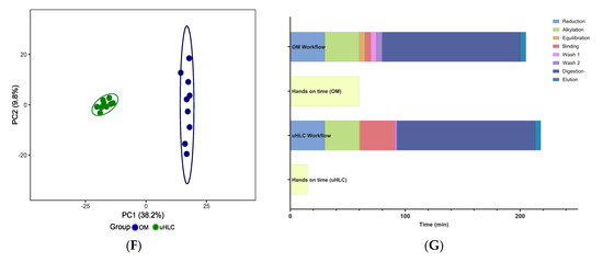 Both workflows required a similar total time to complete from start to finish (218 min uHLC vs. 205 min OM). However, the hands-on time was 15 min for the uHLC method and 60 min for the OM workflow (Figure 2G).