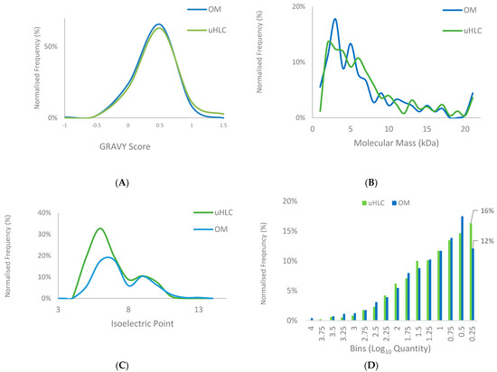 The protein GRAVY score, molecular mass, and isoelectric point distributions were similar between both methods, showing little to no biases (Figure 3A–C). The protein isoelectric point showed a slight difference in the number of proteins recovered below a pI of 8, where uHLC showed a greater overall recovery. The uHLC workflow appeared to identify more proteins (16% vs. 12%) in the lower abundance range than the OM workflow (Figure 3D).