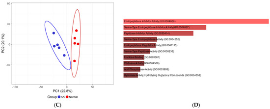 Data analysis of the urinary proteome revealed the presence of many proteins reported in the literature as candidate biomarkers of renal dysfunction. Selected known markers showed differential abundance between cases and controls (Figure 4A,B). The PCA analysis showed a distinct clustering of the limited number of AKI and normal participants based on quantitative proteomic data (Figure 4C).