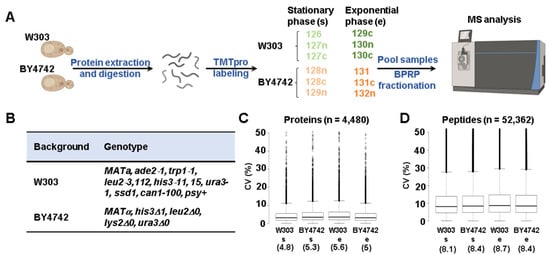 Experimental workflow, genotypes of the strains used, and coefficient of variation among replicates. (A) Wild-type yeast cells of W303 and BY4742 genetic backgrounds were grown in exponential (e) and stationary (s) phase in triplicate. Cells were harvested and lysed, after which proteins were precipitated. Following digestion with LysC and trypsin, the peptides were labeled with tandem mass tag (TMTpro) reagents, as indicated, pooled 1:1, and fractionated by basic pH reversed-phase (BPRP) HPLC. This panel has been assembled, in part, using Biorender.com. (B) Genotypes of the S. cerevisiae strains used in the experiment. Distribution of the coefficient of variation (CV) for the replicate measurements at both the (C) protein and (D) peptide level. The median CV is indicated below the graphs.