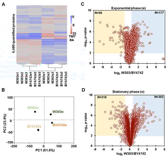 Proteome-wide abundance profiling of differentially abundant proteins when comparing the two yeast genetic backgrounds. (A) Hierarchical clustering analysis of the TMT relative abundance (TMT RA) for proteins quantified across the 12 TMT channels. (B) Principal component analysis (PCA) of the dataset reflects the clustering of the replicates (C,D). The volcano plots illustrate differentially abundant proteins (i.e., |log2 ratio| >1 and p-value < 0.01) between the two yeast genetic backgrounds in both (C) exponential and (D) stationary growth phases.