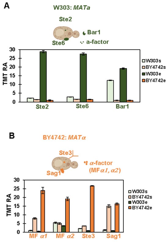 Analysis of mating-type-specific proteins. The TMT RA (relative abundance) values are shown for proteins involved in the mating type pheromone signaling pathway. (A) The highlighted proteins are specific for mating type a (W303): the alpha-factor receptor (Ste2), the a-factor transporter required to export a-factor (Ste6), and the protease Bar1. (B) The highlighted proteins are specific for mating type alpha (BY4742): the mating factor α: MFα1 and MFα2; the a-factor receptor (Ste3); the alpha cells-specific agglutinin protein (Sag1). This figure has been created, in part, using Biorender.com. Error bars represent the standard deviation of triplicate measurements.