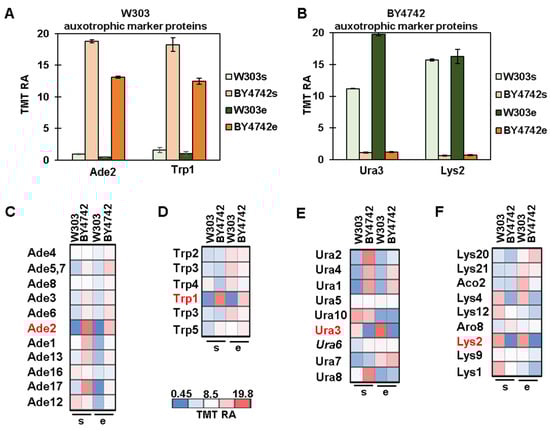 Analysis of background-specific auxotrophic marker proteins and their associated metabolic pathways. TMT relative abundance (TMT RA) of auxotrophic marker proteins for (A) W303-specific or (B) B4742-specific strains. Error bars represent the standard deviation of triplicate measurements. TMT RA of the metabolic enzymes of the indicated pathways, specifically (C) adenine, (D) tryptophan, (E) uracil, and (F) lysine. Metabolic enzymes corresponding to auxotrophic markers are shown in red.